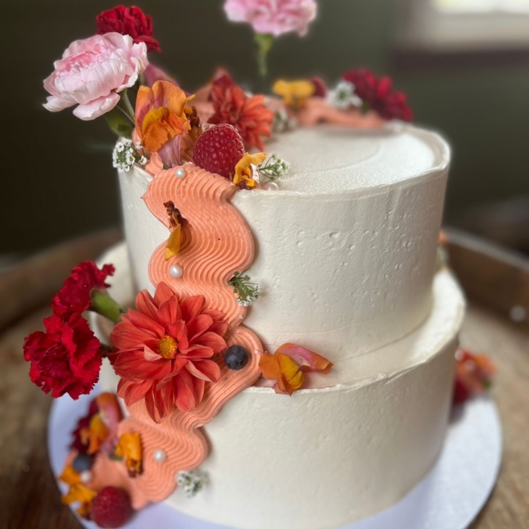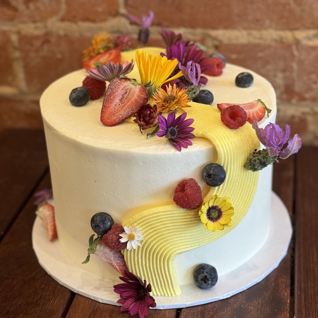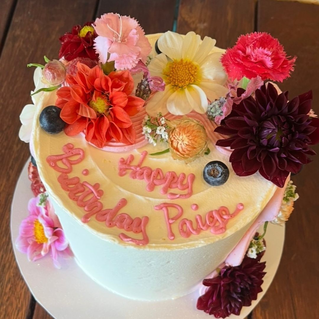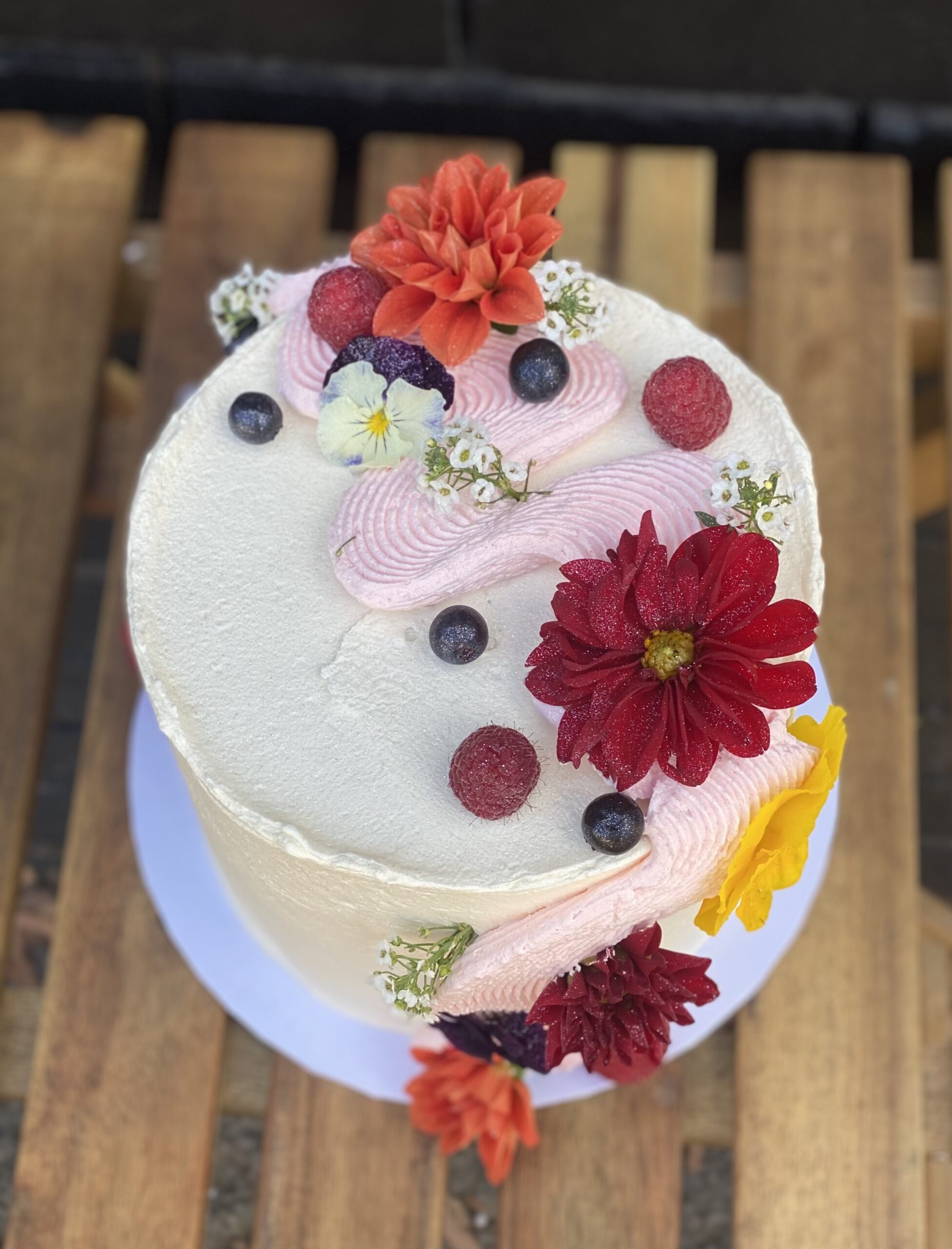 Our seasonal Cottage Garden cake lives up to its name, adorned with a vibrant mix of fresh, locally and organically grown flowers and berries. Available for collection on Fridays & Saturdays only.