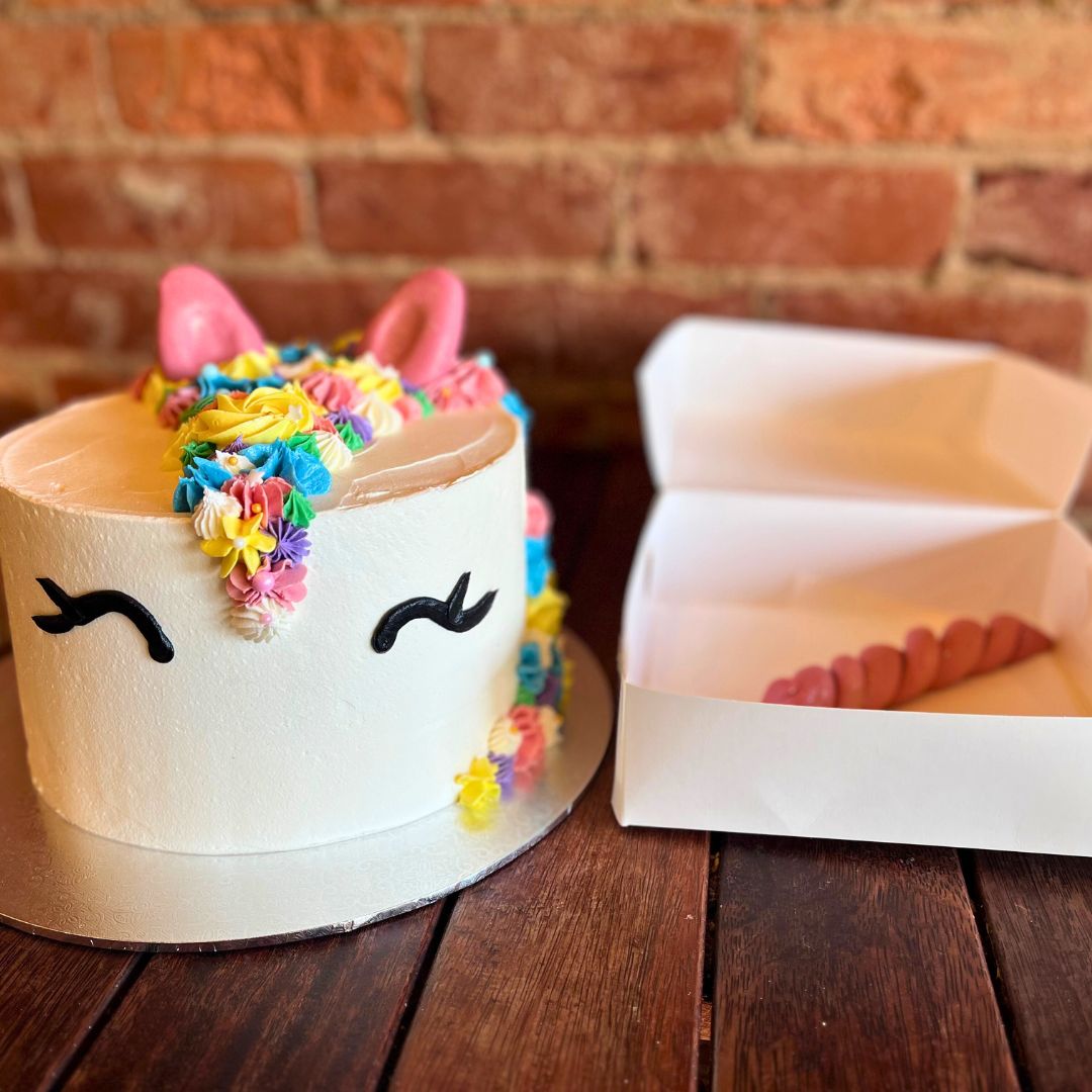 This is a two-part cake, so please be sure to leave the shop with two boxes. One box contains the cake, and the other holds the horn, which should be kept at room temperature. We pack it separately because fondant toppers designed to stand upright can lean or droop if refrigerated.